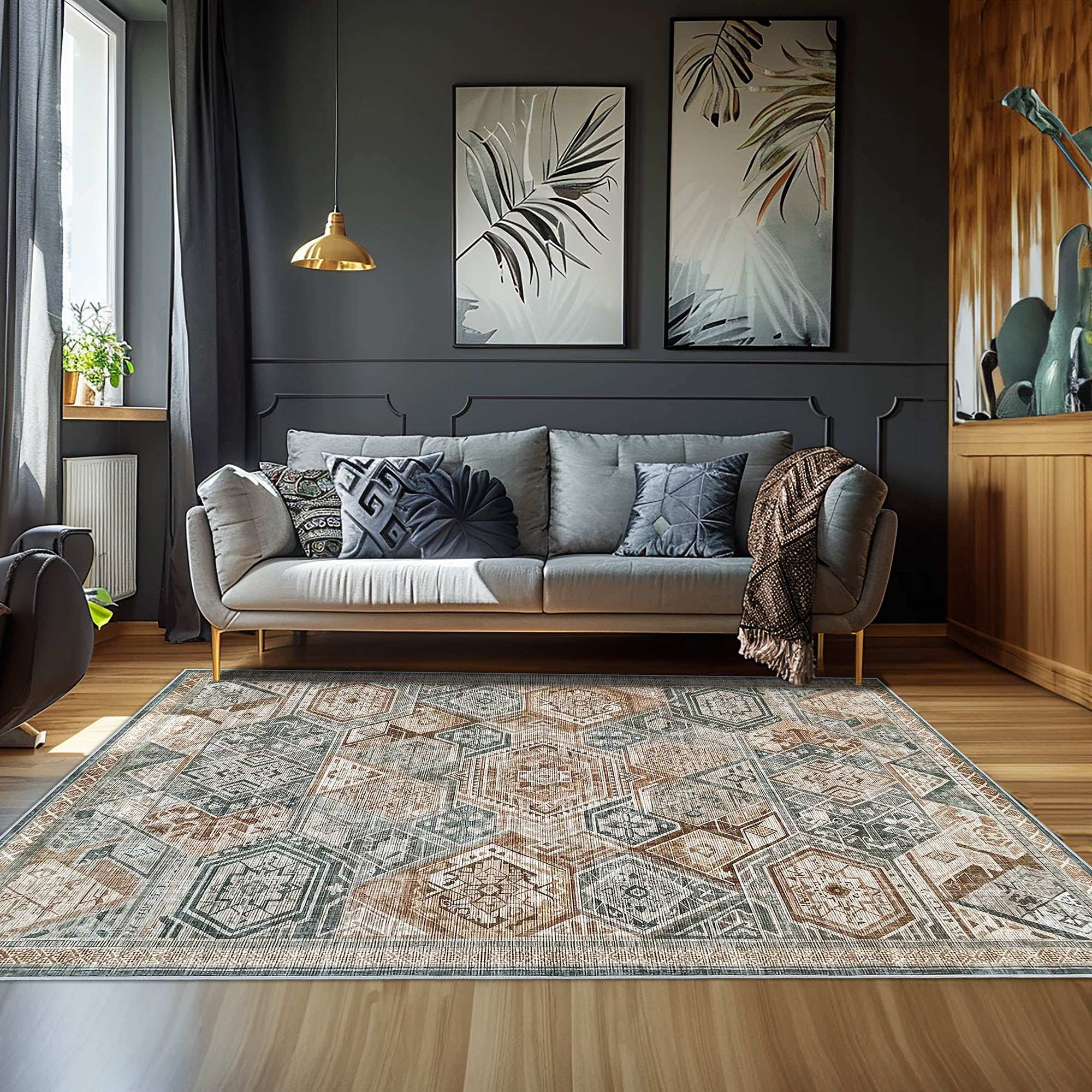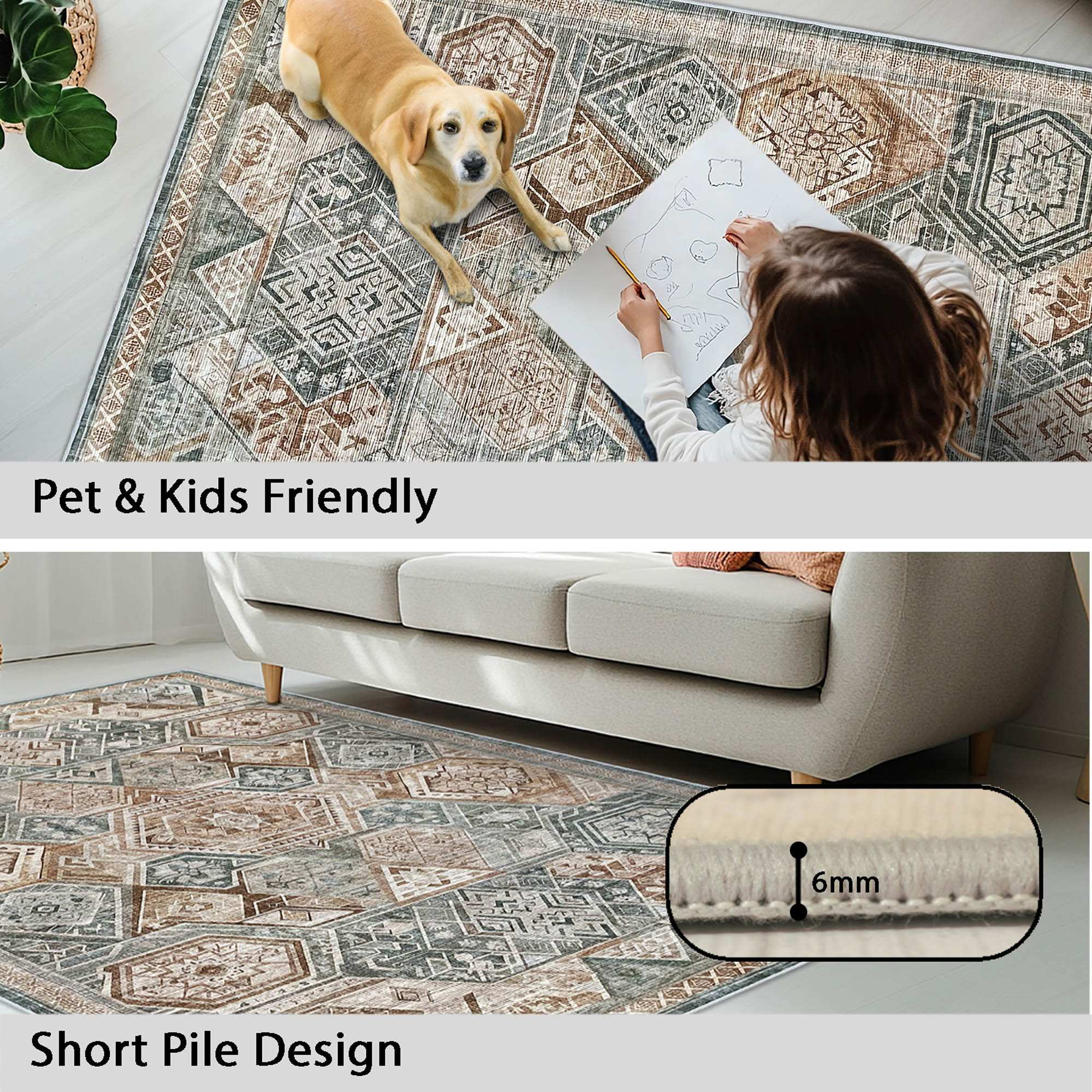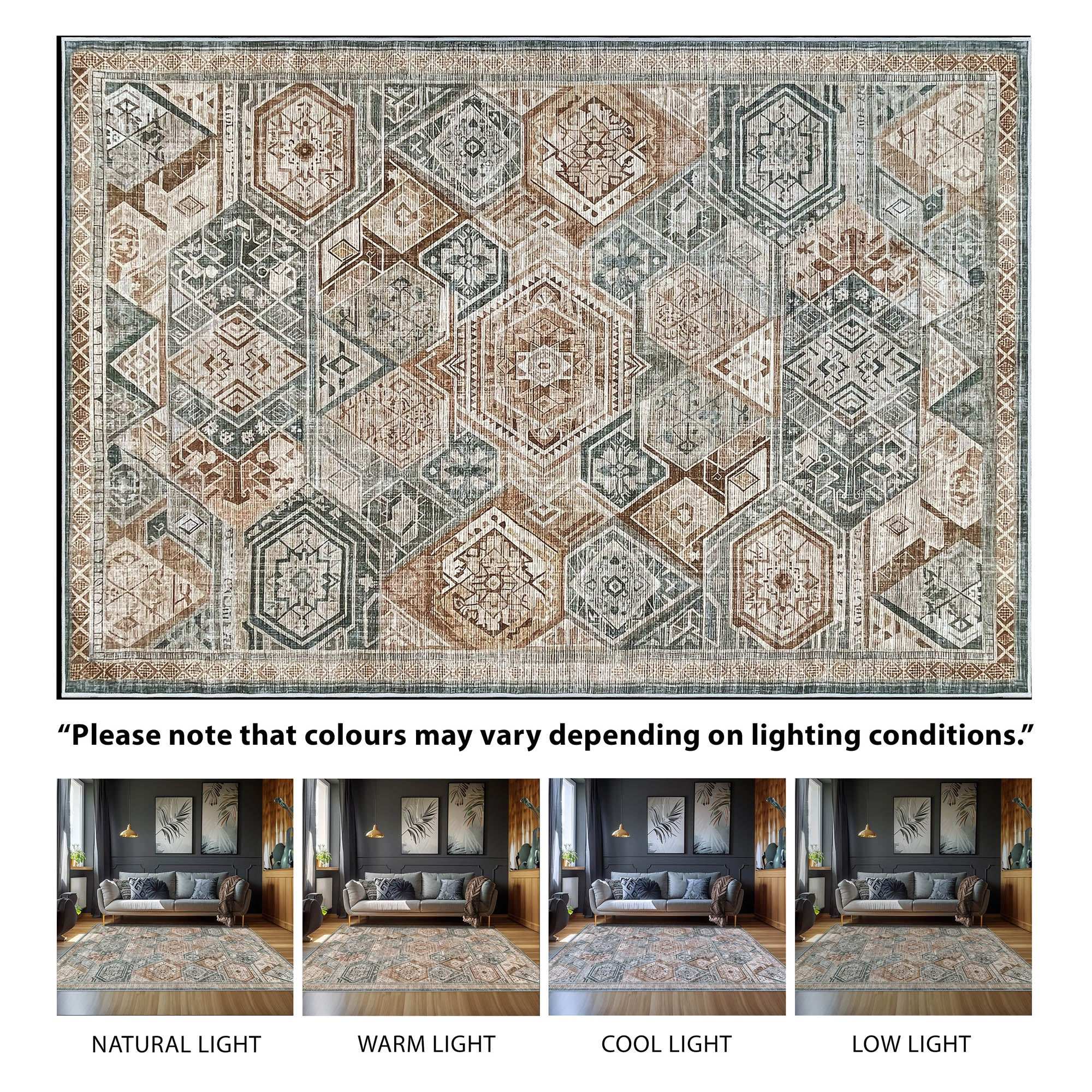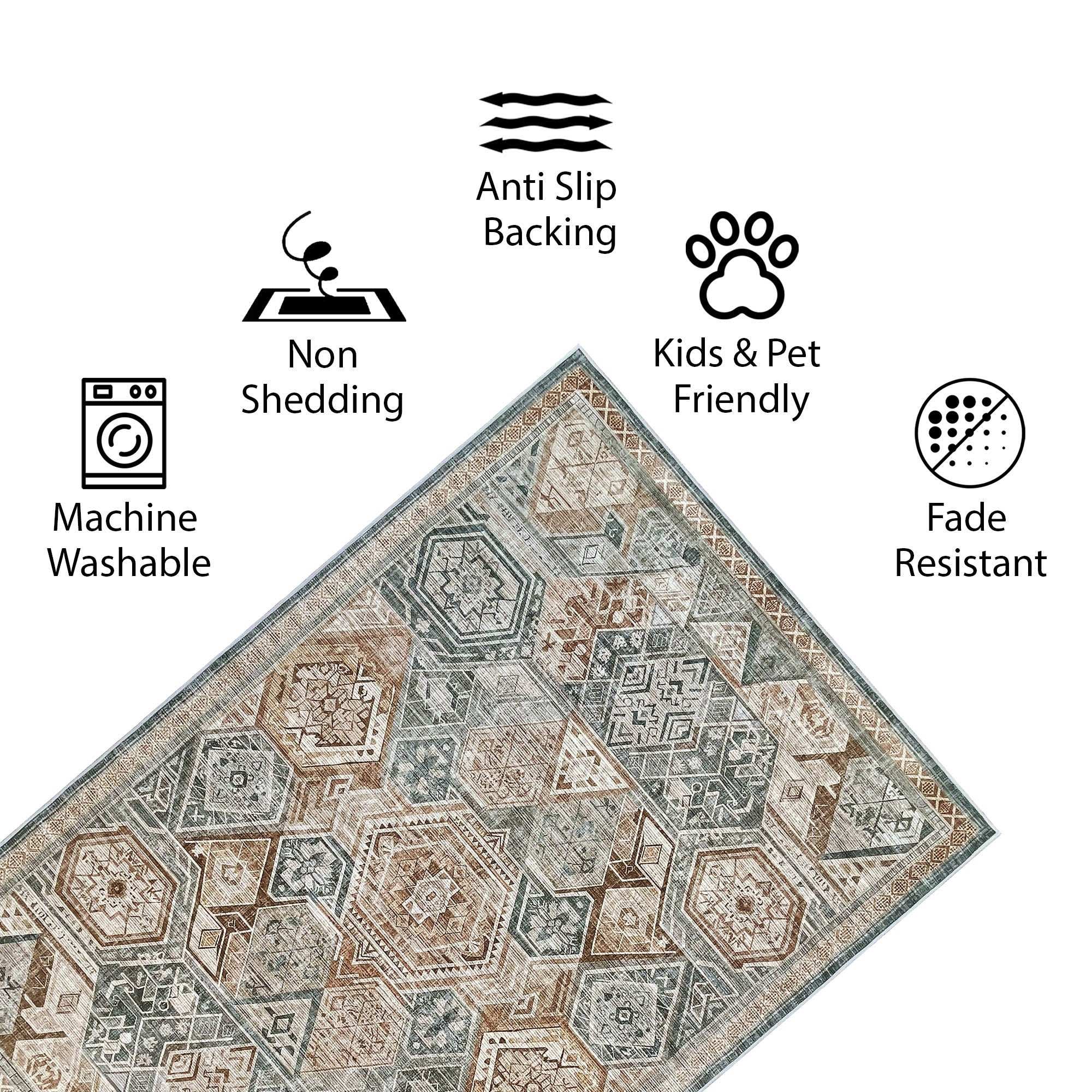Vernal Freya Green, Brown and Beige Machine Washable Rug and Runner - For Living Room, Dining Room, Bedroom, Hallway, Kitchens, Kids/Nursery Room