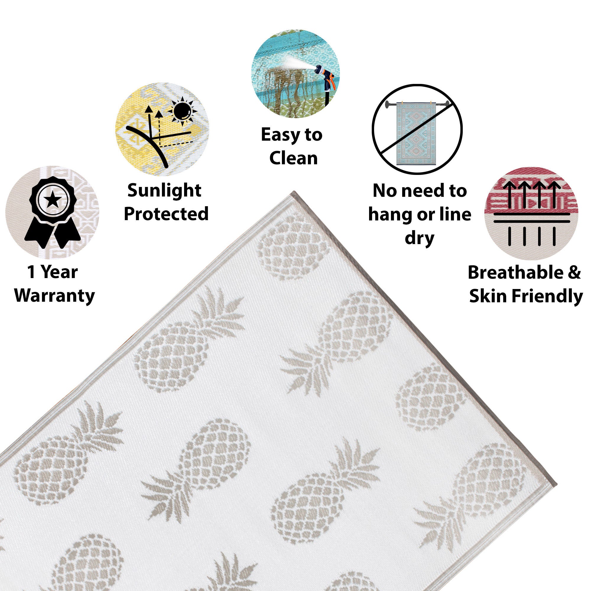 Eco Friendly & Sustainable : Our outdoor rugs are made from recycled materials. They are both eco-friendly and sustainable.Washable : You can easily wipe the rug clean and hose it off with water. Dry it in an instant and rug looks brand-new.Waterproof : Our plastic outdoor rugs do not retain water and can be left outside in rain.Fully Reversible : Get a subtly different look every time you flip the rug.Lightweight - Easy to Carry : Going for a picnic or camping or a beach trip? Simply throw our rug in the boot of your car as it is lightweight.PET Friendly : Your pets will love our rug. As it is pet friendly, it does not collect hair or retain smells. Simply wash with water and mild soap to remove any dirt or poo.UV Protected : Our rugs are made to resist fading and sun exposure. They will not fade and retain their lustre for a longer time.Durable : Let go of your wear and tear worries, since the rug is made from durable materials. It will withstand outdoor elements.Available in a range of sizes : You’ll find a rug for your every outdoor space since we have a variety of sizes to choose from.